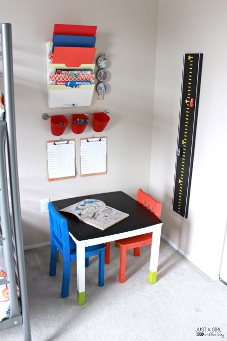 Since the boys’ room is multi-functional, I also tried to create zones. All of their toys were on the ladder shelf. All art supplies were in the craft corner, etc.