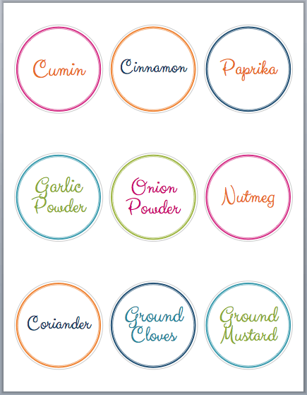 These were designed to fit the Avery 22818 round labels, so you can print them directly onto the labels or you could just print on card stock and attach them with tape. There are labels for baking/cooking items…