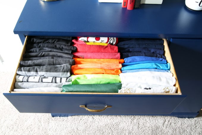 Along with being able to find everything easily, my boys share a not-huge dresser. If I was still trying to use the more traditional stacking method for storing their clothes, there is no way I would fit everything in one piece of furniture. With the filing method, everything fits easily!
