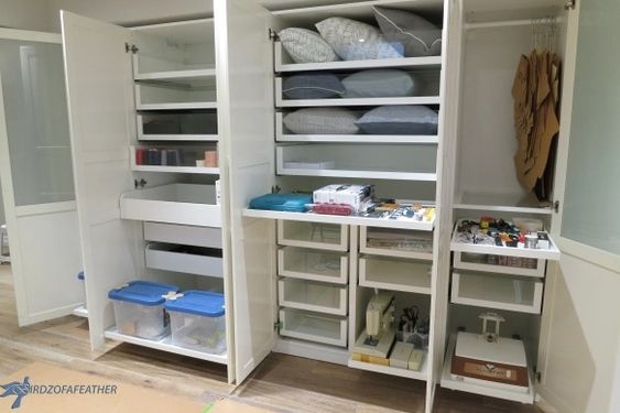 She used IKEA’s PAX system to create a custom closet for storing her craft supplies. I am drooling over all of her lovely, organized pull-out drawers and trays!
