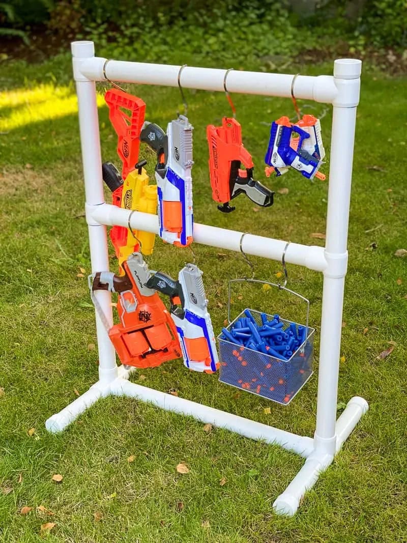 Nerf guns seem to multiply and they’re awkward to store. This hanging solution keeps them tidy without taking up too much space.