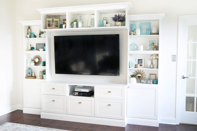Update: It has now been more than 5 years since we built our custom IKEA entertainment system, and it is still holding up beautifully! It’s the perfect centerpiece to our living room, has tons of storage, and I love to decorate the open shelving for each season. We’d do another IKEA BESTA project in a heartbeat!