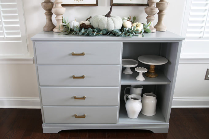 I love styling shelves, so a display area was on my list for this piece. We removed the door on the cabinet part of the dresser and decided to add a shelf instead.