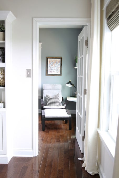 Right when you walk in the door of Donnie’s office, you’ll see his seating area. He had wanted a POANG chair for years but never had room for one in our old house, so he got his wish with this office!
