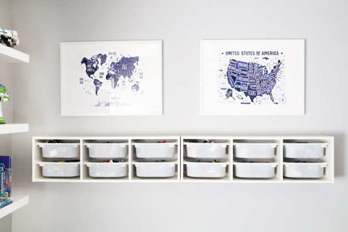 Since we had to hang the wall storage units fairly low so Caleb could reach them, I was left with a big space above them. I grabbed two large RIBBA frames and filled them with cute map prints– one of the world, and the other of the US.