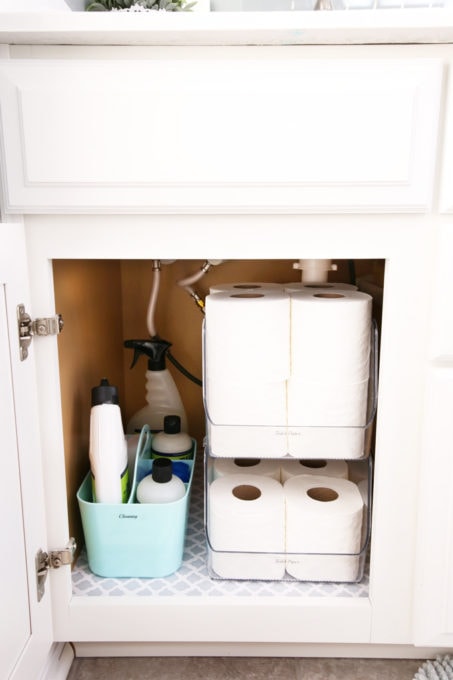 Keep the area under the sink organized by dividing like items into containers. Sponges in one drawer, Magic Erasers in another drawer, dishcloths in a third drawer, etc.