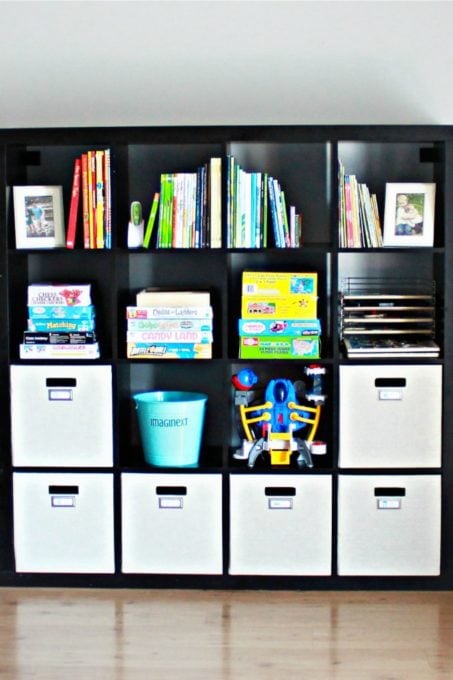 Organize toys by type in bins or on shelves. IKEA’s KALLAX cube unit even has inserts to create cabinets and drawers.