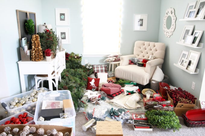 I begin by collecting allllll of my Christmas stuff from around the house and putting it in one spot. It’s helpful to empty all of the bins so I can easily see everything that is there.