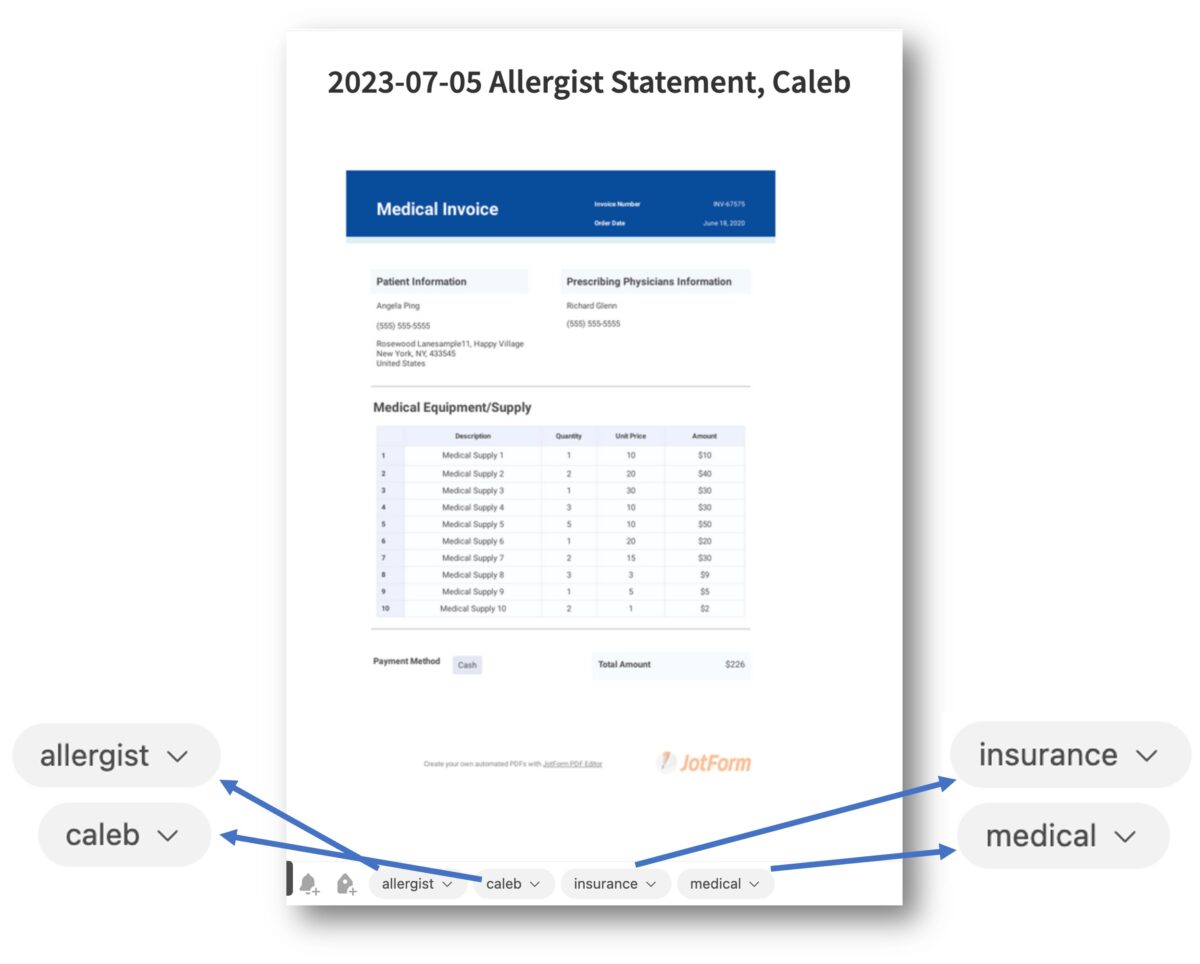 In the case of the statement from the allergist, in Evernote I can tag that one statement with “allergist” AND “Caleb” AND “insurance” AND “medical,” and searching any one of those terms will bring me the document within seconds.