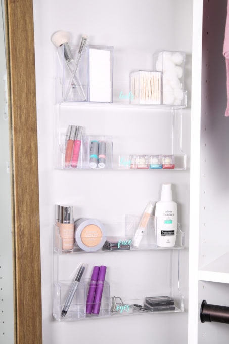 In our current closet, I used acrylic spice racks to hold my makeup on an empty piece of wall. I can sit right in front of my full-length mirror and get ready in the morning.
